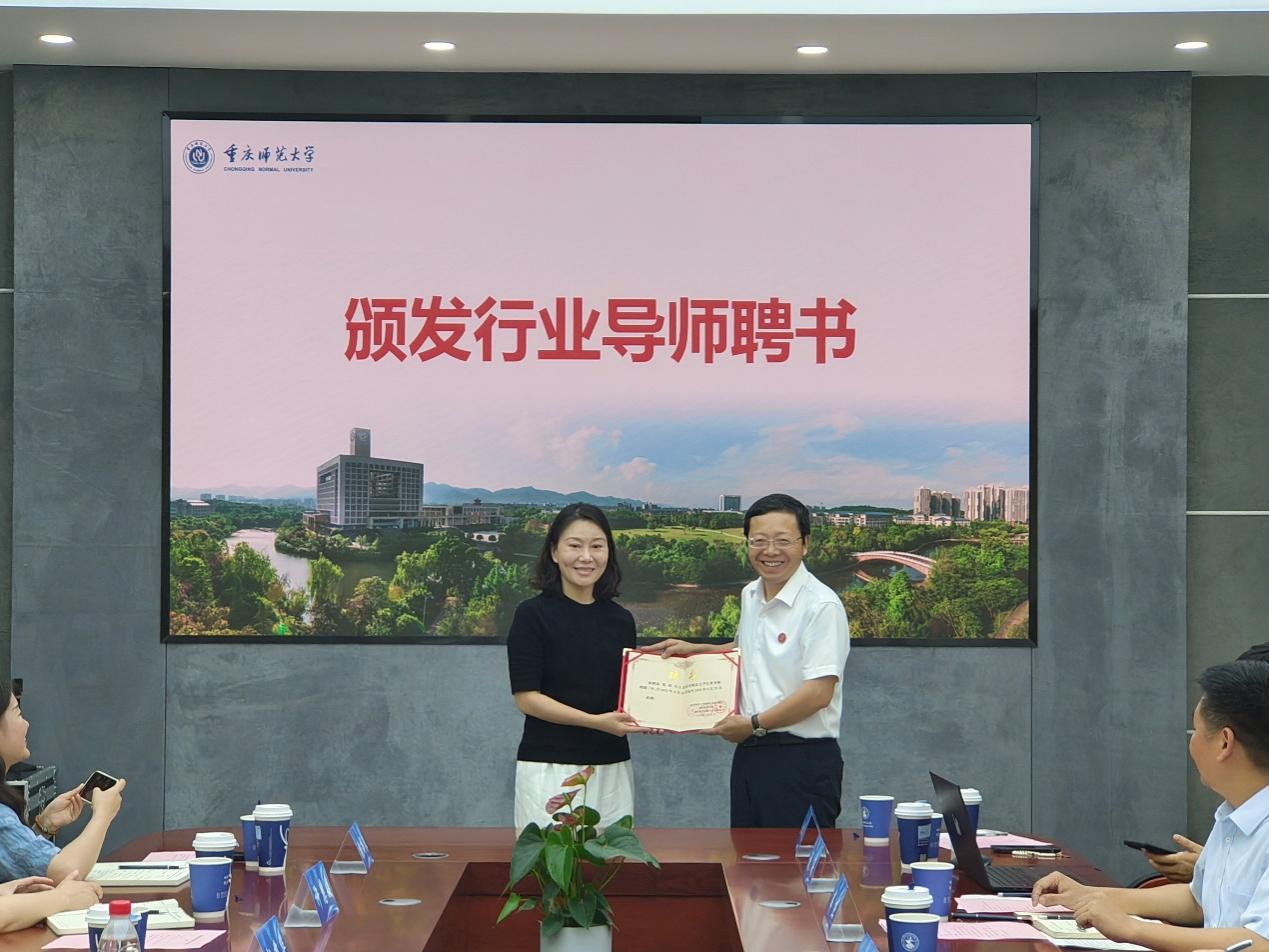 (校党委常委、副校长孟小军为象外文旅张蓓总裁颁发了行业导师聘书)