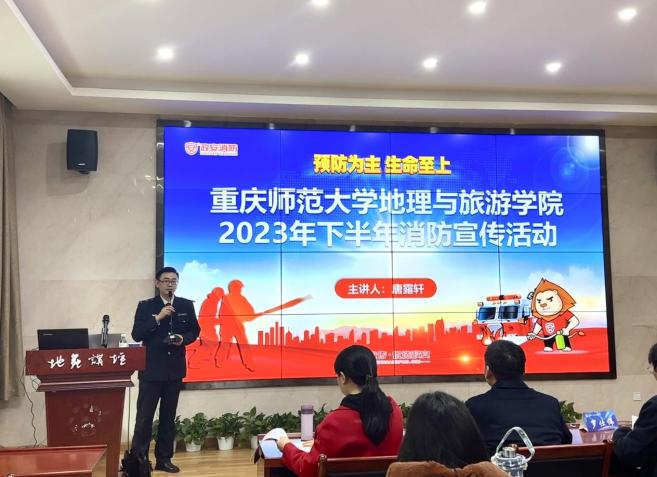 在培训会上,唐露轩教官以生动的实例和数据向在场的师生介绍了火灾的严峻形势。他强调今年11月消防月的主题:“预防为主,生命至上”,并通过去年在缙云山山火和北京长峰医院发生的火灾案例,引发了对火灾的深刻思考和警示。“平均每十五天牺牲一名消防员,消防员平均年龄仅为20岁。提高安全意识,做好安全防范工作,不仅是对我们自己负责,还是对消防员负责!生命无价,我们需怀有敬畏之心。”唐教官通过数据、图像、视频等方式生动地讲解了消防安全工作的重要性、讲解火灾的种类和起因,并针对不同火种向大家传授正确的防范措施,还讲述了公共场所和家庭防火的基本常识以及在火场中易出现的一些逃生误区和正确的逃生自救方法,让在场的师生感受到火灾的严重性,也加深了对消防安全隐患的警觉性。