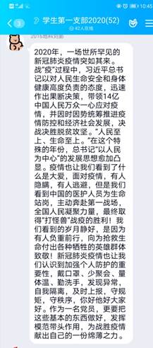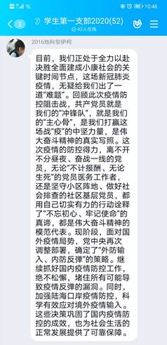 本次党组织生活会围绕“迎党的生日、讲战疫故事、悟初心使命”主题展开,支部每名成员说身边故事、讲切身体会,勉励毕业生党员牢记使命担当,把不忘初心、牢记使命作为终身课题。首先,瞿书记对世界杯冠军预测 2016级地理信息科学专业张川伟、2016级旅游管理(职教师资)专业张宣友两名同学在疫情期间在重庆机场担任40天志愿者、接待外宾的工作给予了肯定,高度评价了世界杯冠军预测 多位同学在战疫中无私奉献、敢于担当的突出表现,同时号召一支部全体学生党员向他们学习。接下来,邹梦芸同志分享了她在疫情期间在高速路口为期八天的志愿者工作心得,赞扬了医护人员不畏艰辛、积极奉献的精神;张璐同志分享了身边的党员案例,小区门禁因人手不足,党员带着几岁的孩童上岗工作,这种无私奉献的精神值得所有党员同志学习;马君草同志分享了对钟南山院士先进事迹的感悟,号召党员同志学习钟南山院士“说实话,办实事”的精神;许晓同志通过中外现状对比,看到了祖国的强大,国家能够保障人民生活;熊瑜丽同志对身边在医院工作的亲人的工作历程进行分享,先进事迹来自于生活点滴;任杰同志分享了人民对于疫情期间防控的积极配合,展现了人民在面对危机的团结与努力。学生第一党支部的其他线上党员都通过网络发表了自己的心得体会以及疫情期间的身边先进事迹、先进榜样。