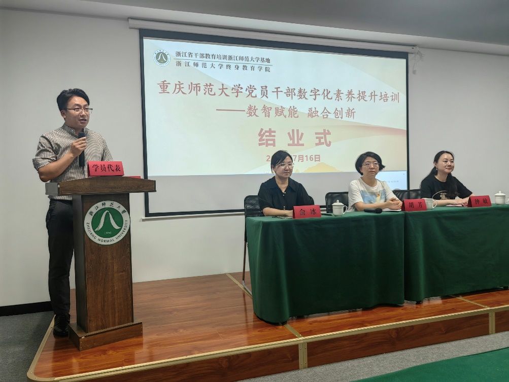 的党员教师代表陈昌东表示,本次培训目标明确、内容丰富、方式多元,每一堂课都在颠覆学员们的传统思维,让大家真切感受到数字化已从概念蓝图落地为提升教育质效的核心生产力。陈老师动情地形容这是一场收获之旅,学员们带着问题而来,携着理念与方法而归。他代表全体学员承诺,定将把“数智赋能、融合创新”的理念融入重师发展血脉。