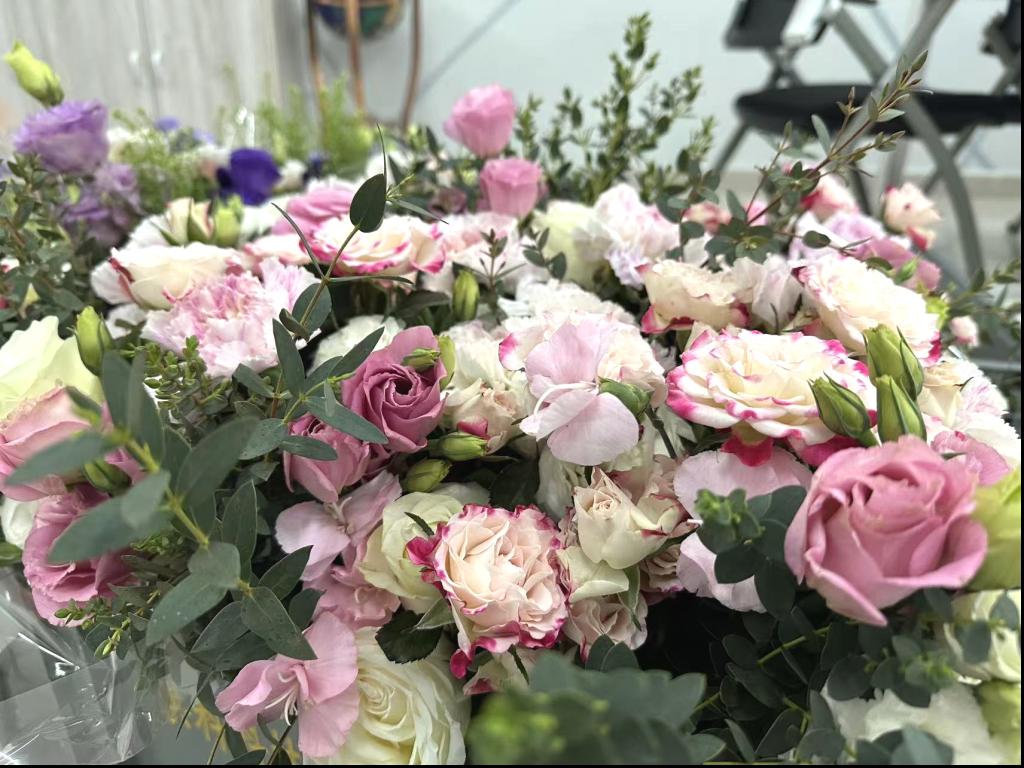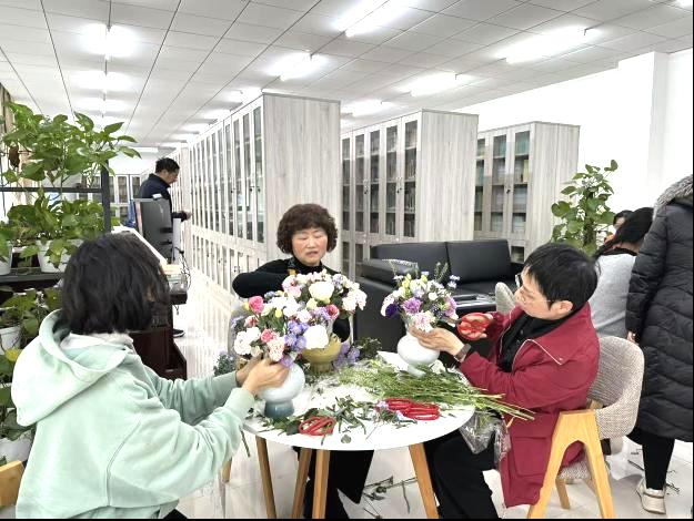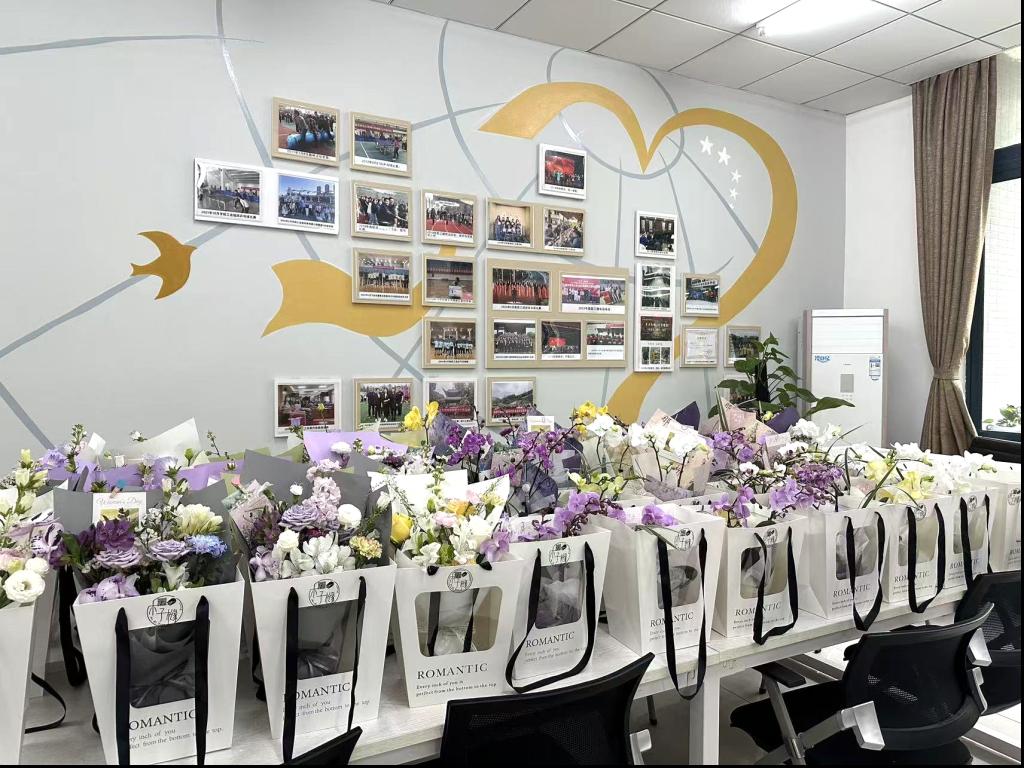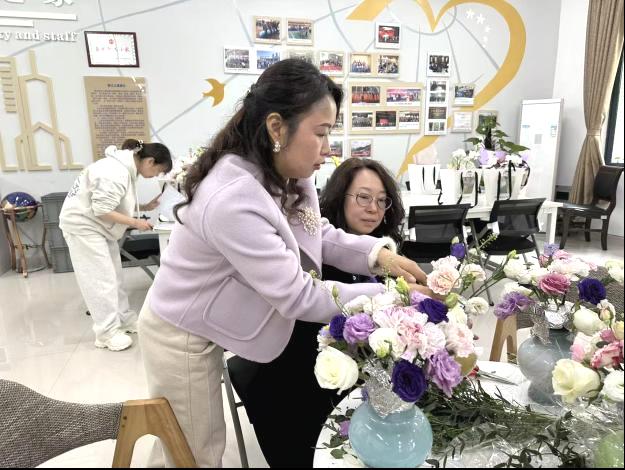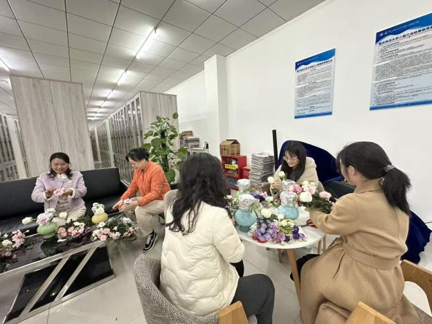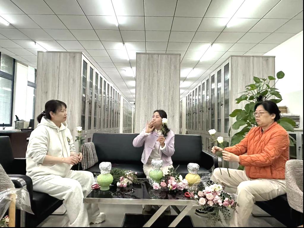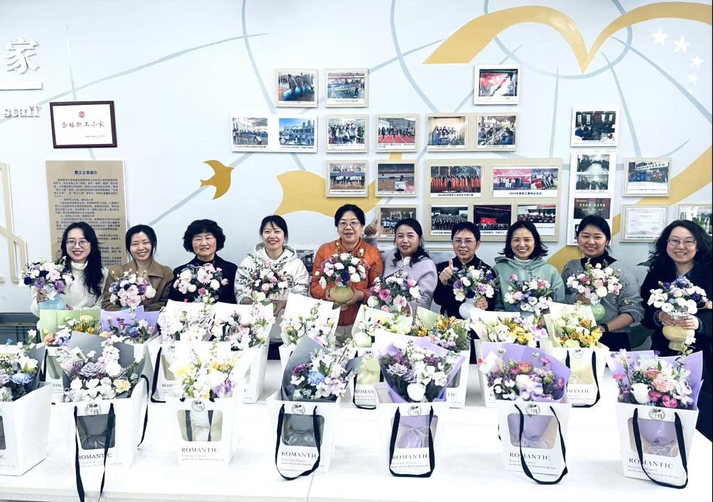 女老师们在职工之家齐聚一堂,在花香与创意中感受节日的温馨与美好。活动现场布置温馨雅致,桌上摆满了精心准备的各色花材——娇艳的玫瑰、清新的康乃馨、雅致的洋桔梗、葱郁的绿叶,色彩斑斓,春意盎然。