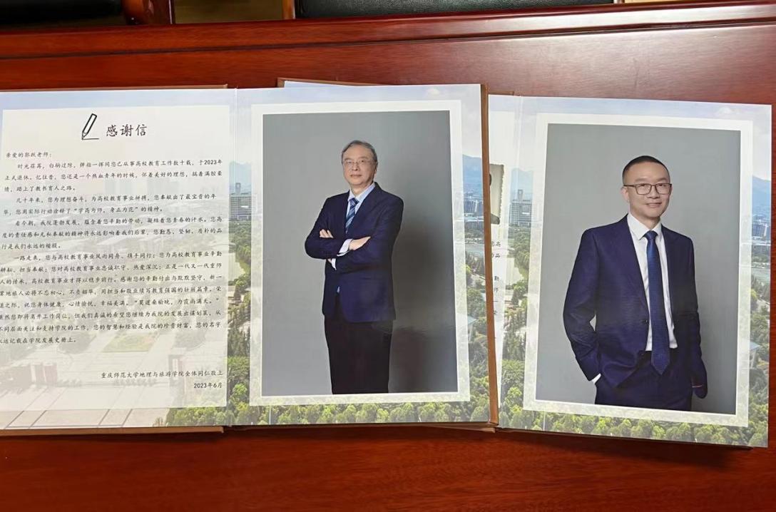 (校工会刘涛副主席为荣休教师送上荣休纪念册和鲜花)