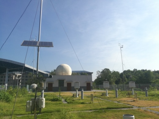 气象园位于校园西南角,占地面积约1140 m2。目前,设有气象分析室、数据处理室和观测场。气象分析室主要用于气象数据分析和室内教学。数据处理室配备有气象生态环境监测系统,用于学生观察和下载自动气象站数据。观测场配备有风向计、百叶箱(干湿温度表、最高温度表和最低温度表)、虹吸式雨量计、雨量器和曲管地温计等。观测场内还配备了自动气象站和降水降尘自动采样器,能够满足气象实验教学需求。