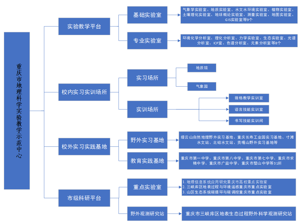 校外实习实践基地主要包括野外实习基地和教育实践基地,支撑开展地理科学类专业的野外实习和地理教育实习。野外实习基地主要包括缙云山植物实习基地、重庆长寿工业园实习基地、贡嘎山野外实习基地、寸滩水文站、北碚水文站等。教育实习基地包括重庆市第一中学、重庆市第八中学、重庆市第七中学、重庆市求精中学、重庆市广益中学、重庆市璧山中学等31所中学。