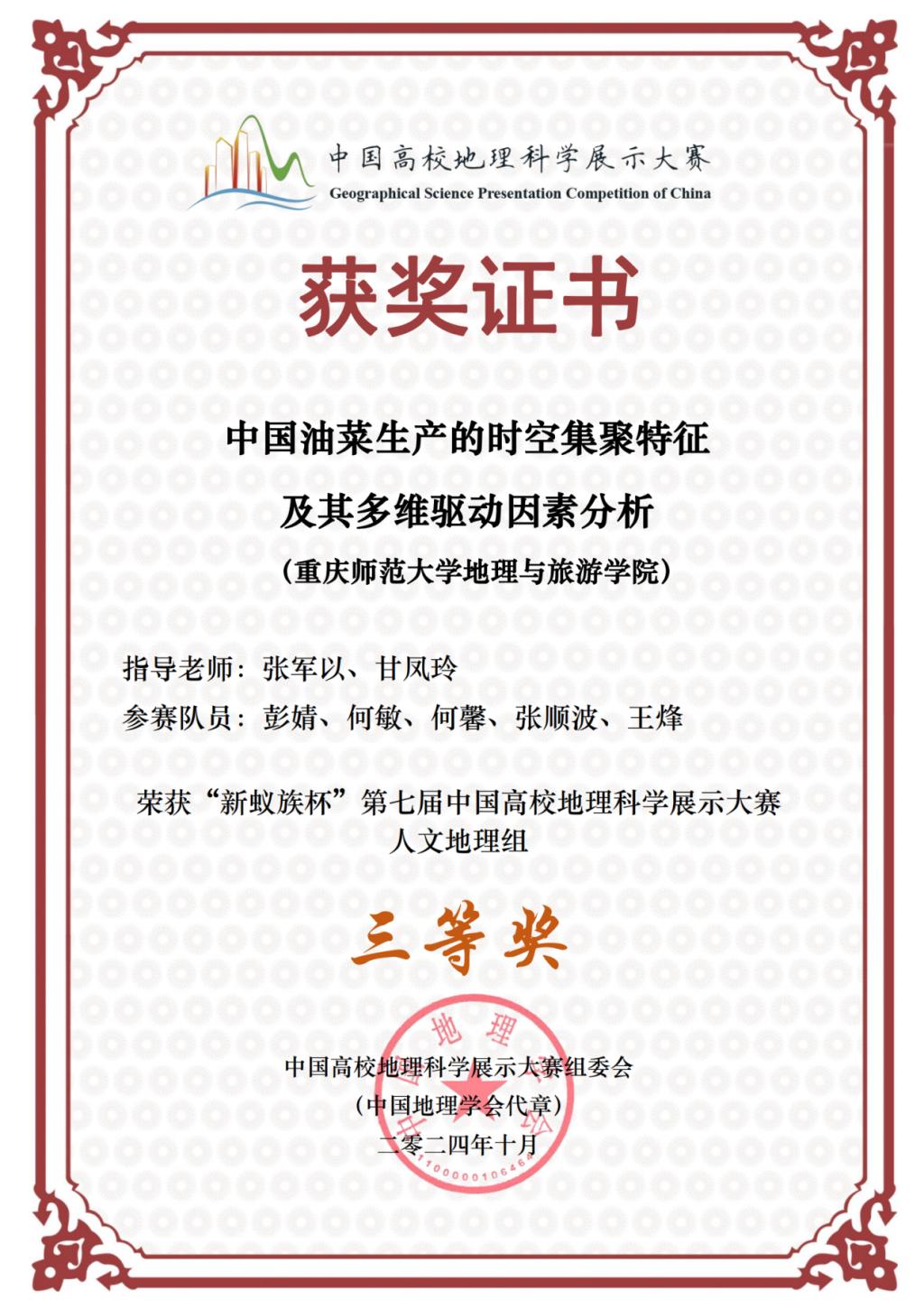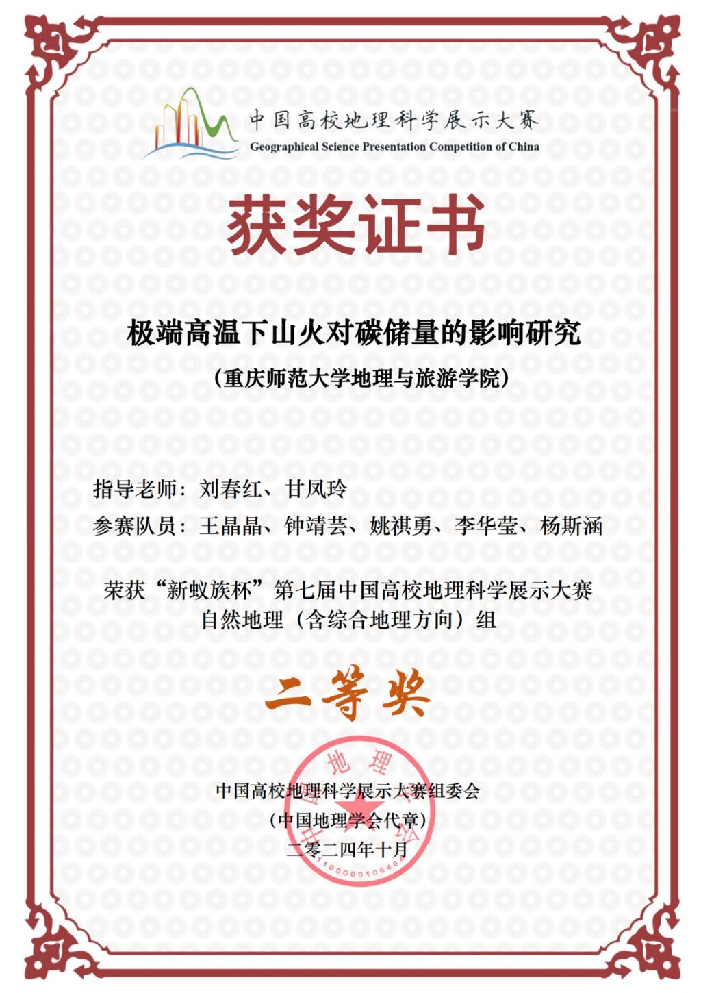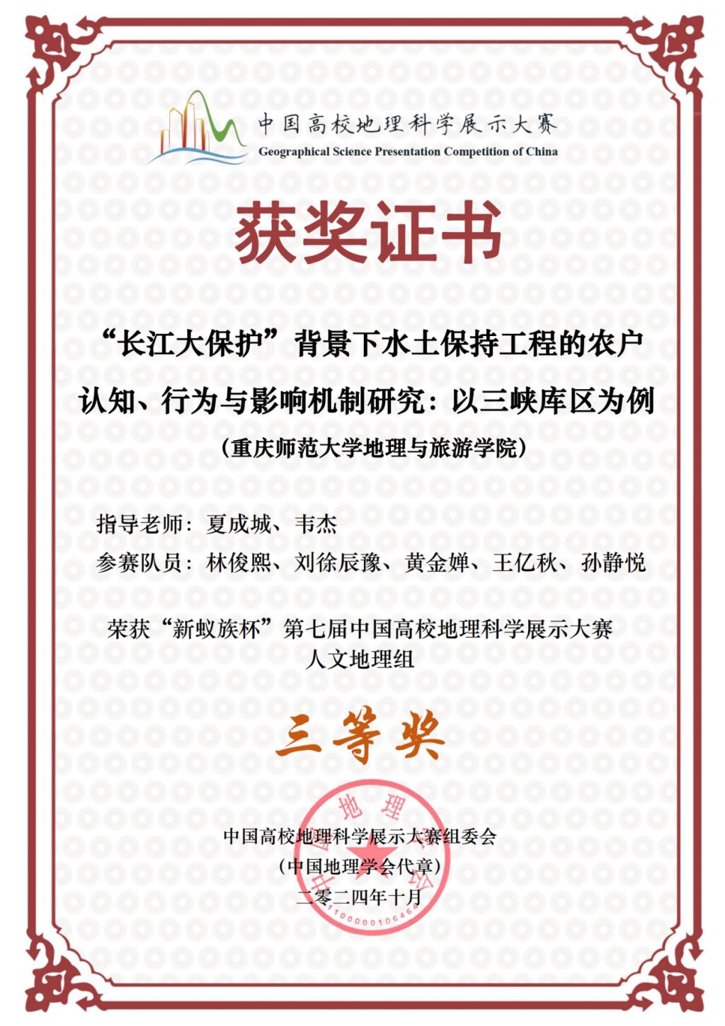 2022级、2023级林俊熙,刘徐辰豫,黄金婵,王亿秋,孙静悦组成的“长江绿梦守护者”队(指导教师:夏成城、韦杰)均在本次大赛中获得全国三等奖。