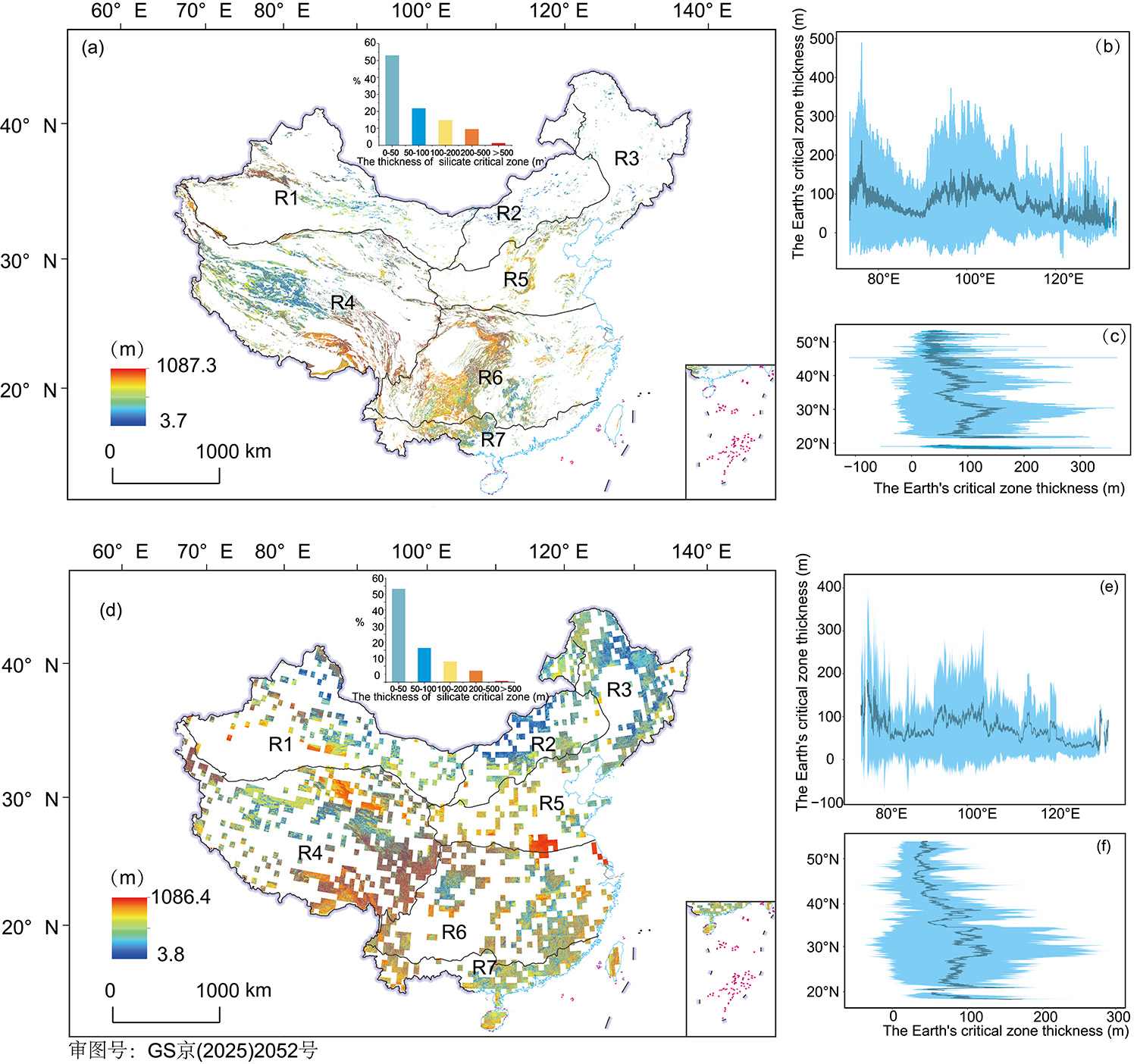 题目:中国碳酸盐岩(a)和硅酸盐岩(d)关键带厚度的空间分布;碳酸盐岩关键带厚度(b)和硅酸盐岩关键带厚度(e)随经度的变化;碳酸盐岩关键带厚度(c)和硅酸盐岩关键带厚度(f)随纬度的变化。