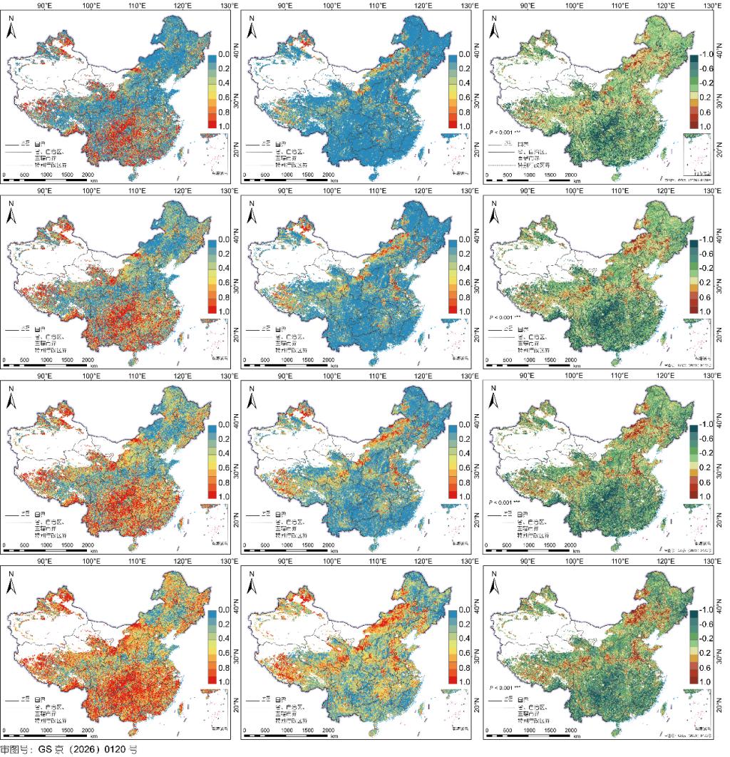 图1 生态工程实施前后轻度干旱条件下不同植被损失风险等级的条件概率对比。第1到4行分别代表极高风险植被损失、高风险植被损失、中风险植被损失、低风险植被损失;第1到3列分别代表生态工程实施前植被损失概率、生态工程实施后植被损失概率、工程实施前后损失概率变化