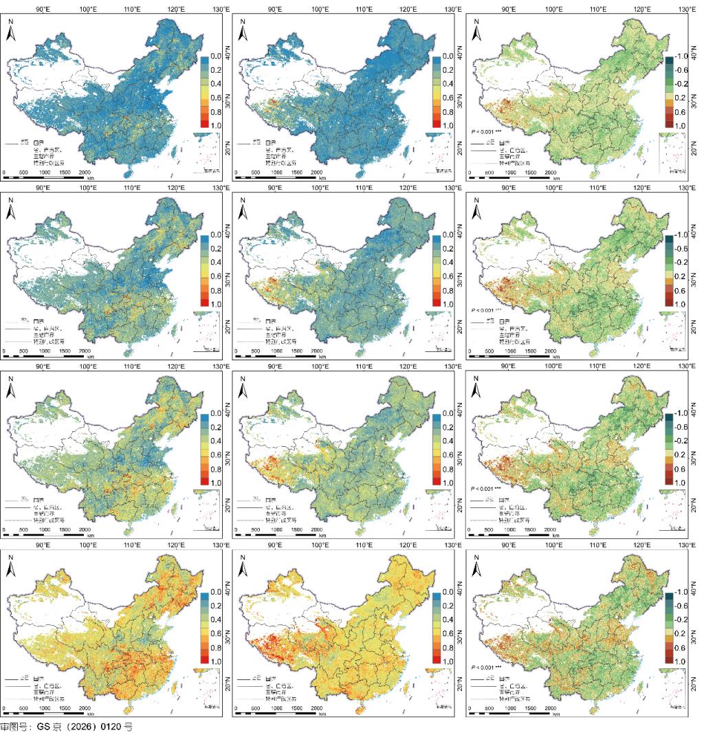 图2 生态工程实施前后高温主导型复合干热条件下不同植被损失风险等级的条件概率对比。第1到4行分别代表极高风险植被损失、高风险植被损失、中风险植被损失、低风险植被损失;第1到3列分别代表生态工程实施前植被损失概率、生态工程实施后植被损失概率、工程实施前后损失概率变化
