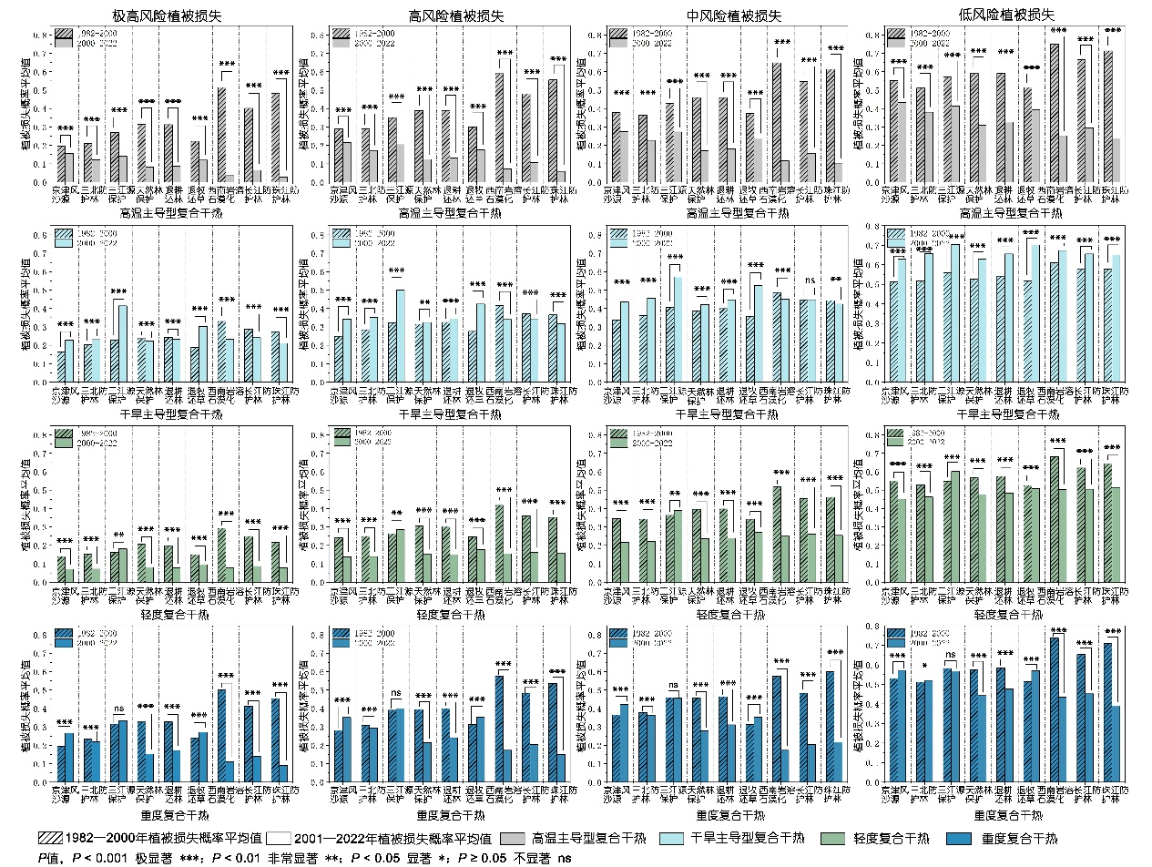 不同生态修复工程类型对不同复合干热条件下植被脆弱性的影响存在差异。复合干热条件下,大部分生态工程实施前后植被脆弱性差异显著(P < 0.001),西南岩溶石漠化综合治理工程、珠江流域防护林体系建设工程、长江流域防护林体系在改善植被脆弱性方面表现最为突出,损失概率降低0.29、0.26、0.20,而三江源生态保护和建设工程治理后植被脆弱性增加。工程实施后,中高风险等级下植被损失概率显著降低,低风险植被损失概率仍较高,需要重点关注。