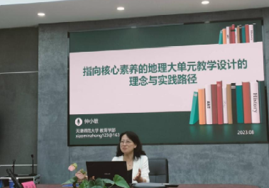 仲小敏教授以“指向核心素养的地理大单元教学设计的理念与实践路径”为题,利用肌体运动和侧方位停车生动地解释了什么是知识、技能和素养及其相互关系,阐释了何为学科核心素养、“大单元”、大单元教学,提出大单元教学是大概念、大任务、大情境统领下教学活动的结构化,并对单元教学的内在逻辑、五大特性及其理论基础进行了说明。最后仲小敏教授以“中华优秀传统文化(大观念)赋能地理单元教学设计”的案例举例说明。