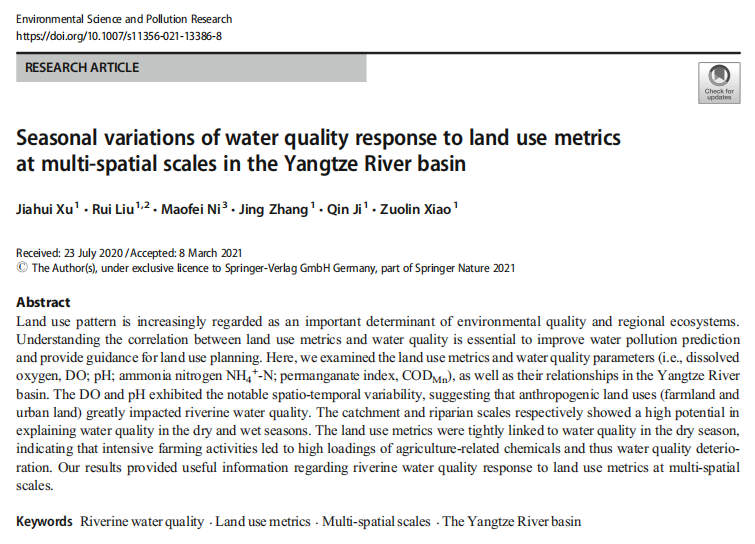 论文主要围绕黄河流域、长江流域、三峡库区等多条干支流的水质问题进行研究,探讨人类活动对河流水质的多时空尺度影响关系。研究结果表明黄河流域范围的人类活动在夏季和河段缓冲区尺度下对水质影响更加显著,长江流域范围内的人类活动在旱季和河岸带缓冲区尺度下对水质影响更大,而三峡库区范围内的人类活动在雨季和子流域尺度下对河流溶解性有机质影响更强。这些结果的不同是由于研究区不同生态背景,不同水文节律,不同耕作方式,以及不同城市化程度导致,研究结果可为黄河流域、长江流域和三峡库区的生态环境保护、河流水质与富营养化管控提供理论依据与数据支撑,具有很强的学术价值与现实意义。