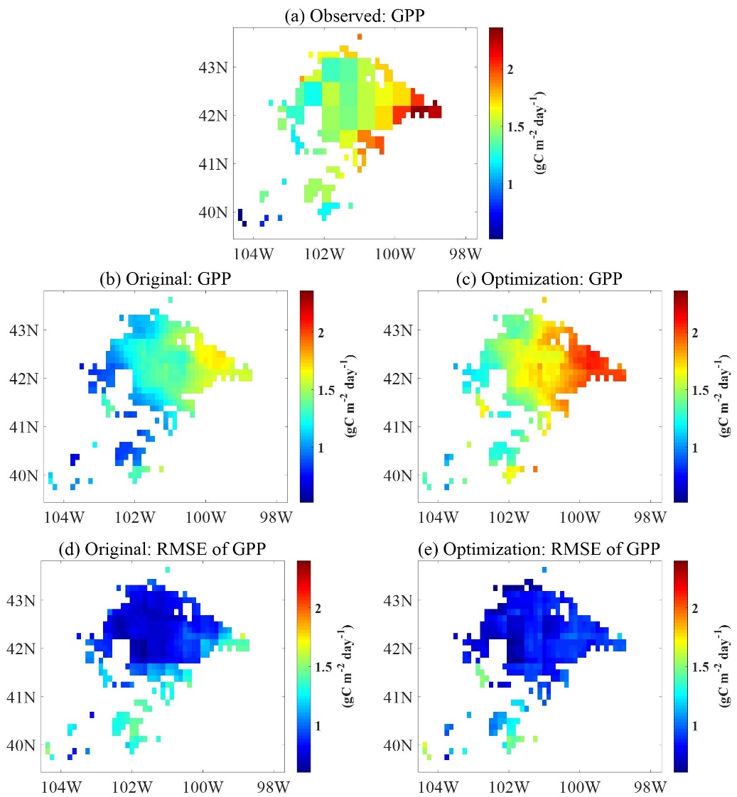 2.总初级生产力模拟的空间比较: (a)观测值, (b)默认值, (c)优化值, (d)默认参数下总初级生产力的RMSE, 以及(e)优化参数下总初级生产力的RMSE.