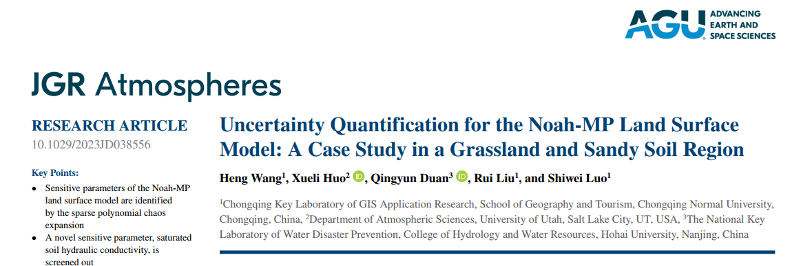 相关研究成果以题为《Uncertainty Quantification for the Noah-MP Land Surface Model: A Case Study in a Grassland and Sandy Soil Region》发表在美国地球物理联合会(American Geophysical Union)的旗舰期刊《Journal of Geophysical Research-Atmospheres》(中科院TOP期刊)。王恒博士为第一作者,世界杯冠军预测 地理信息系统应用研究重庆市高校重点实验室为第一单位。