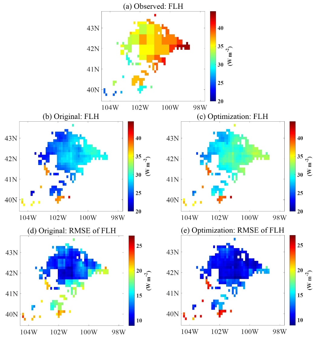 1.潜热通量模拟的空间比较: (a)观测值, (b)默认值, (c)优化值, (d)默认参数下潜热通量的RMSE, 以及(e)优化参数下潜热通量的RMSE.