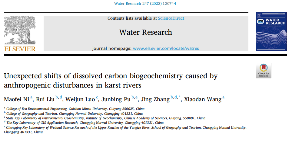 GIS应用创新团队张静博士、刘睿教授、蒲俊兵研究员等以喀斯特河流溶解性碳为对象,共同揭示了人为扰动对其生物地球化学过程的重要影响。研究成果以“Unexpected shifts of dissolved carbon biogeochemistry caused by anthropogenic disturbances in karst rivers ”为题发表在《Water Research》(IF=12.8,Nature Index,中科院一区TOP期刊)上。
