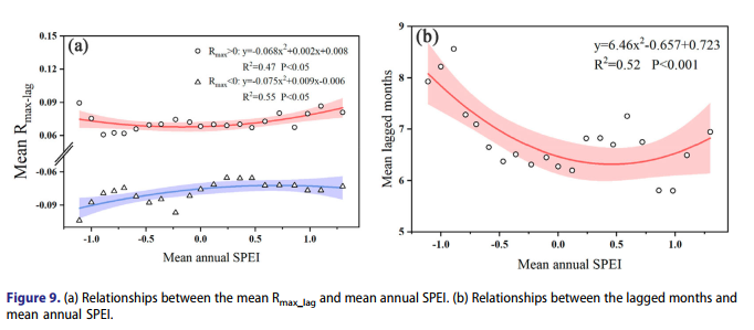 地表过程创新研究团队的陈田田副教授构建干旱指数和人类活动强度指数的基础上,对植被生长的自然和人为驱动因素进行解析。发现,66.41%和54.57%的植被对干旱有时间滞后和累积反应,时间跨度较短,为1-4个月,表明植被生长对干旱的敏感性较高;49.9%的中国植被对人为活动表现出时间滞后效应,时间尺度更长,为6-10年,也就是说,人类活动引发了生态变化,但植被生产力无法跟上生态的变化。