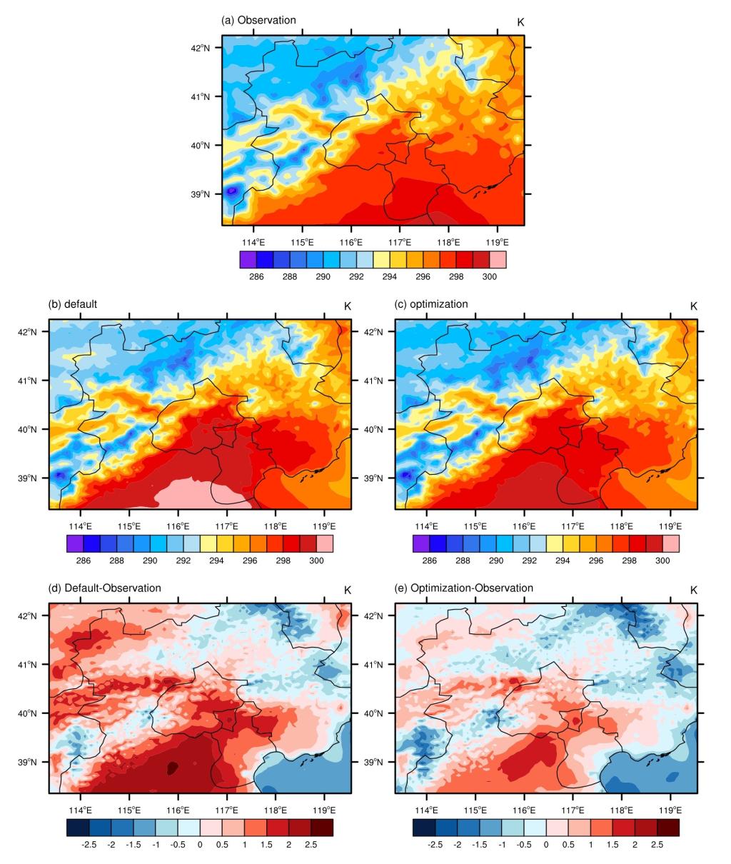 2.率定期气温模拟的空间比较: (a)观测值, (b)默认值, (c)优化值, (d)默认参数下气温的偏差, 以及(e)优化参数下气温的偏差.