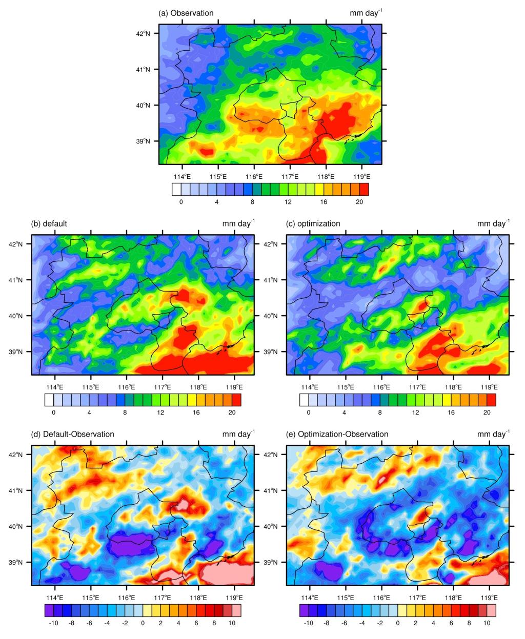 1.率定期降水模拟的空间比较: (a)观测值, (b)默认值, (c)优化值, (d)默认参数下降水的偏差, 以及(e)优化参数下降水的偏差.