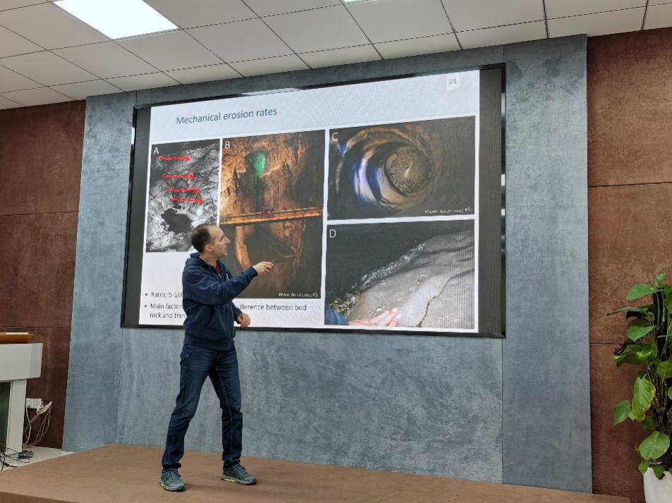 Mitja Prelovšek博士进行了主题为“Rates of underground processes in the NW Dinaric karst”的学术报告,报告从岩溶区溶蚀速率的重要性、第纳尔地区历史溶蚀速率的观测、岩溶含水层不同部位溶蚀速率的差异及对水动力条件的指示意义方面进行了深入的讨论,并提出了建立相关溶蚀速率变化与环境变化的关系函数。