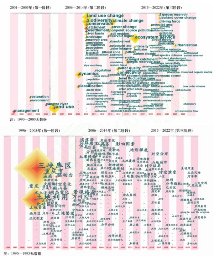 结果表明三峡库区土地利用与生态环境效应经历了3个阶段的演变过程,一阶段重点关注土地整理、土地生态保护等问题;二阶段重点关注消落带、土地利用变化的地形梯度效应等问题;三阶段重点关注景观格局变化的社会-经济生态耦合、生态系统服务等问题,与库区发展及区域政策相吻合研究成果国际影响力不断增强,库首、库腹、库尾研究侧重点不同。
