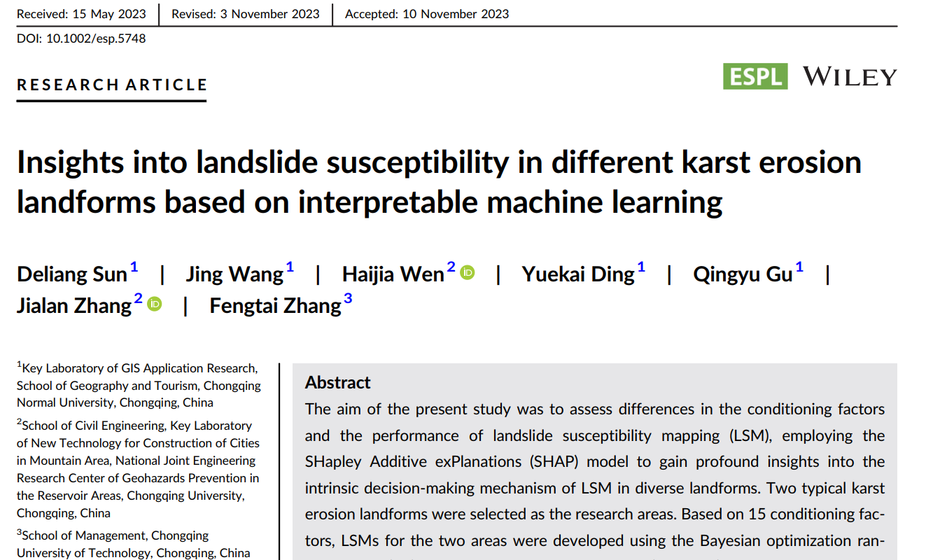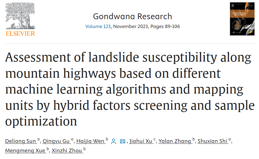 近日,我室孙德亮副教授团队在山地公路滑坡易发评价方面取得重要研究进展,论文“Assessment of landslide susceptibility along mountain highways based on different machine learning algorithms and mapping units by hybrid factors screening and sample optimization”发表于国际学术期刊《Gondwana Research》。联合重庆大学文海家教授和重庆理工大学张凤太教授在不同喀斯特地貌下的滑坡易发评价方面取得重要研究进展,论文“Insights into landslide susceptibility in different karst erosion landforms based on interpretable machine learning”发表于国际学术期刊《Earth Surface Processes and Landforms》