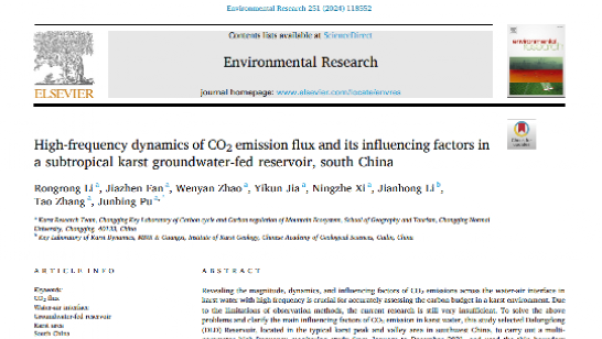 山区生态系统碳循环与碳调控重庆市重点实验室蒲俊兵研究员团队在地学与环境学领域国际TOP期刊Journal of Hydrology(一区、IF=6.4)、Environmental Research(一区、IF=8.3)发表系列研究成果:“Effects of rainfall on the karst-related carbon cycle due to carbonate rock weathering induced by H2SO4and/or HNO3”、“High-frequency dynamics of CO2 emission flux and its influencing factors in a subtropical karst groundwater-fed reservoir, south China”、“Aquatic photosynthetic carbon pump driven by periodic temperature variations affects dissolved inorganic carbon and hydrochemical characteristics in a groundwater-fed reservoir”。相关研究从岩溶水文系统视角出发,初步揭示了外源酸干扰下降水对岩溶碳循环的影响机制、水库热结构变化与BCP效应的耦合对水体溶解无机碳(DIC)和 δ13CDIC时空变化的控制机制、岩溶区典型水库水-气界面CO2排放的高频连续变化特征与影响机制,研究结果为校正岩溶碳循环模型具有重要意义。