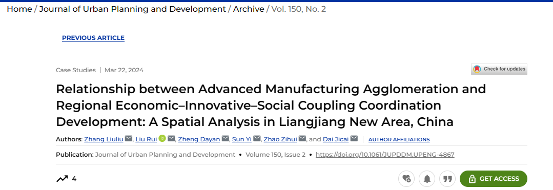 GIS应用创新团队地图学与地理信息系统专业研究生张柳柳基于多源地学数据,采用双变量自相关分析等方法,以国家级新区——两江新区为例,从细微空间粒度上测度了两江新区先进制造业集群状况与区域“经济-社会-创新”耦合协调水平,探究了先进制造业与区域多维耦合协调发展的空间关联特征,揭示了先进制造集群对区域发展的作用方式。研究成果以“Relationship between Advanced Manufacturing Agglomeration and Regional Economic–Innovative–Social Coupling Coordination Development A Spatial Analysis in Liangjiang New Area, China”为题发表在《Journal of Urban Planning and Development》上。研究生张柳柳为第一作者,刘睿教授为通讯作者。