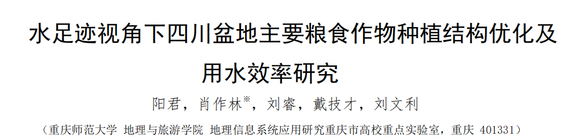 地图学与地理信息系统专业研究生阳君基于水足迹理论量化四川盆地3种主要粮食作物用水量,并以此为基础构建蓝水和灰水足迹最小化,经济收益最大化的多目标优化模型,得到不同节水情景(5%、10%和15%)下的最优作物种植结构,最后通过用水效率指数分析优化前后各地农业用水效率。研究成果以“水足迹视角下四川盆地主要粮食作物种植结构优化及用水效率研究”为题发表在《农业工程学报》上。GIS应用创新团队研究生阳君为第一作者,肖作林老师为通讯作者。
