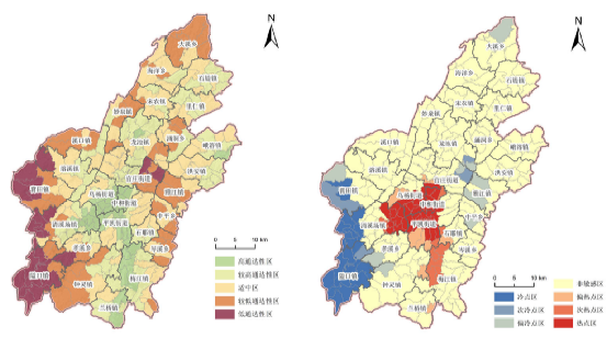 路网通达性综合评价结果(左图),冷热点空间分布结果(右图)