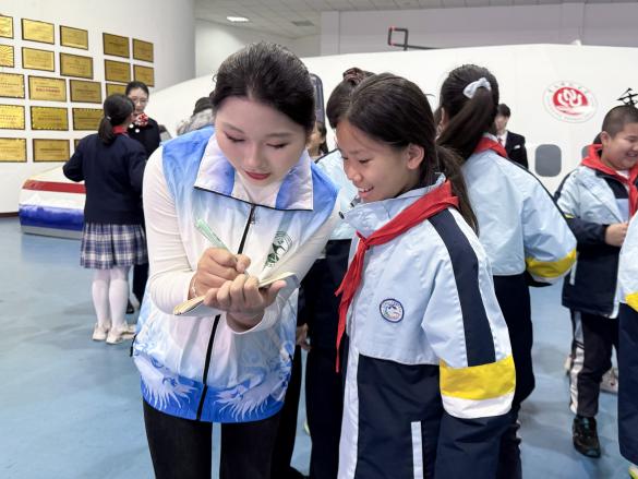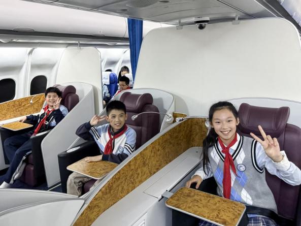 航空服务艺术与管理专业宣传部40余名成员全程接待与讲解,为小学生们带来了一场沉浸式、互动性强的航空知识启蒙之旅。在志愿者引导下,小朋友们来到了模拟客舱实训室,当看到一比一还原的真实飞机客舱时,孩子们发出了阵阵惊叹。空乘宣传部的“空乘人员”们不仅细致讲解了客舱内的设施设备,如座椅、行李架、阅读灯和呼叫铃的使用方法,还带小朋友们现场体验了从登机到下机的全流程服务。随后,在航模展厅,志愿者们用浅显易懂的语言,向孩子们介绍了中国民航的基本知识和国内具有代表性的航空公司,生动的讲解激发了孩子们浓厚的兴趣,他们纷纷举手提问,现场气氛热烈,俨然一堂活泼有趣的航空安全知识科普课。
