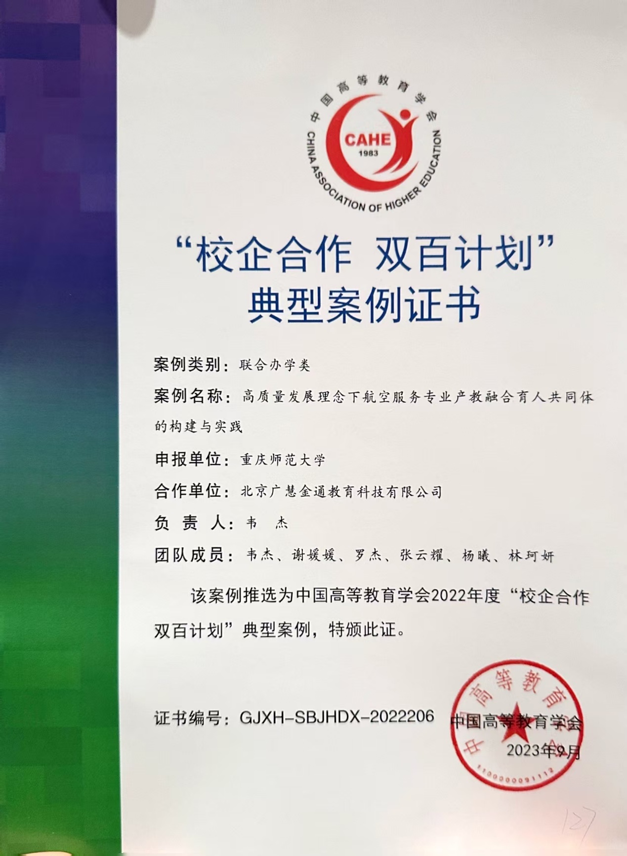 与北京广慧金通教育科技有限公司合办航空服务艺术与管理专业,办学经验获中国高等教育学会“校企合作 双百计划”典型案例。