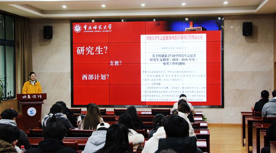,开展为期一年的基础教育教学志愿服务。随后,她分享了重师研究生支教团的故事,以第24届研支团成员、航空服务艺术与管理专业2018级的徐静同学为例,讲述了她在西藏昌都支教的动人经历。她引用了“用一年不长的时间,做一件终生难忘的事”这句格言,深深触动了在场同学的心灵,同时也在他们心中种下了扎根基层、服务西部的种子。