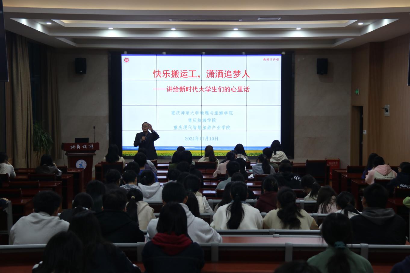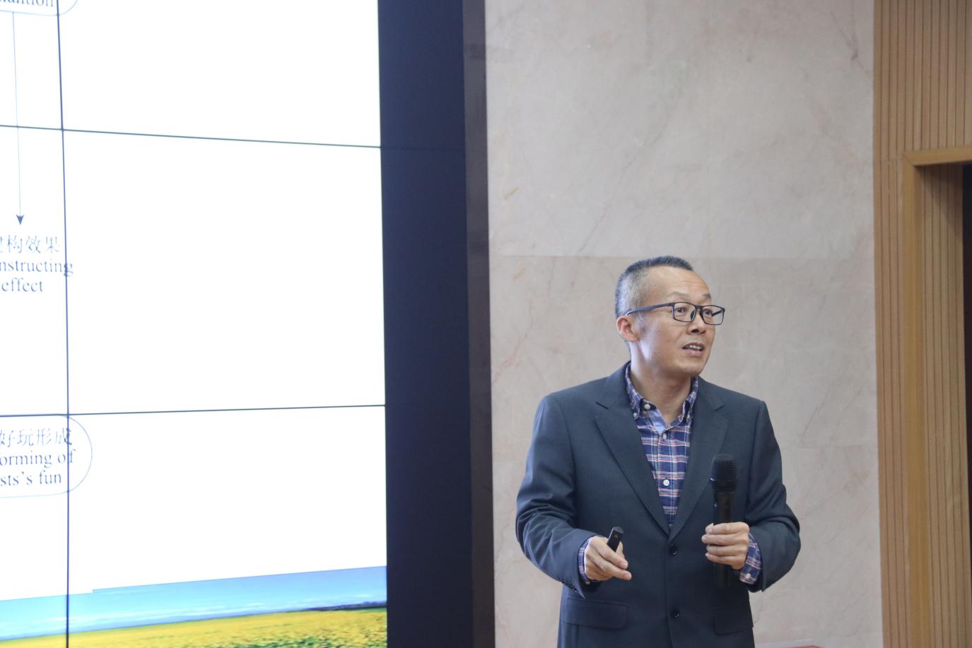 传东教授以“快乐搬运工,潇洒追梦人——讲给新时代大学生的心里话”为主题,立足于青春热情,从旅游相对论、旅游发展观、旅游哲学观和人生体验四个方面展开演讲。引导同学们深刻理解旅游的重要价值,增强其对旅游的认知和兴趣,鼓励同学们勇于追逐梦想。胡教授通过四对“有限”和“无限”的关系阐述旅游相对论,提出旅游活动是人与生俱来的需求。接着以旅游的场景性、驿动性、生活性、享受型来说明旅游发展观,以见天地、见众生、见自己阐明旅游哲学观的具体内容。然后提出“人在旅途,读者无疆”的人生经验。胡教授指出“在伟大的时代要敢于做一个平凡但不平庸的人”。