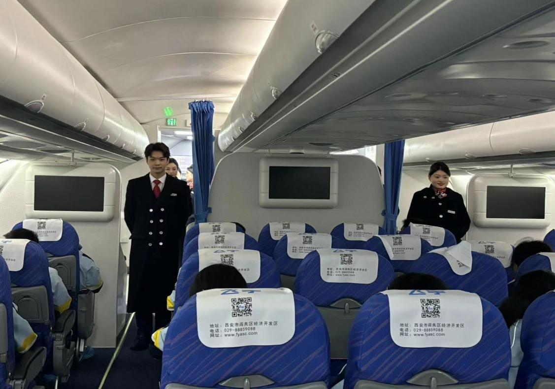 在带队老师的组织下,附小的252名小学生积极配合、文明礼貌,纷纷穿上鞋套有秩序地进入模拟舱体验服务。在航空服务艺术与管理专业老师的指导下,2022级的助教团队为小学生们展示了实景化的航班客舱场景。