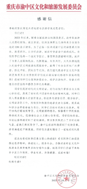 21级旅游管理(对口高职)班7名学生受渝中区导游协会委托,在洪崖洞景区,争当渝中区文明旅游排头兵、宣传员和践行者。期间,同学们遵照渝中区文旅委关于“切实服务游客,践行诚信文明,高效处置问题”的要求,积极开展了志愿服务工作,受到广大游客的好评,也收到了渝中区文旅委的书面感谢信。