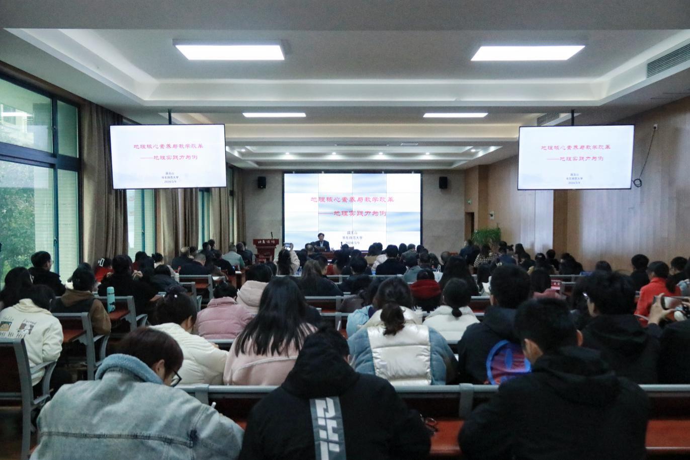 讲座开始,段教授进行简单的自我介绍后就本次讲座主题“地理核心素养与教学改革——地理实践力为例”提出五大点:一.地理实践力国家课程要求;二.地理实践是地理学的学科本质;三.地理实践力是地理育人的重要突破口;四.对国际地理实践的重视;五.落实与考查地理实践力的方法。