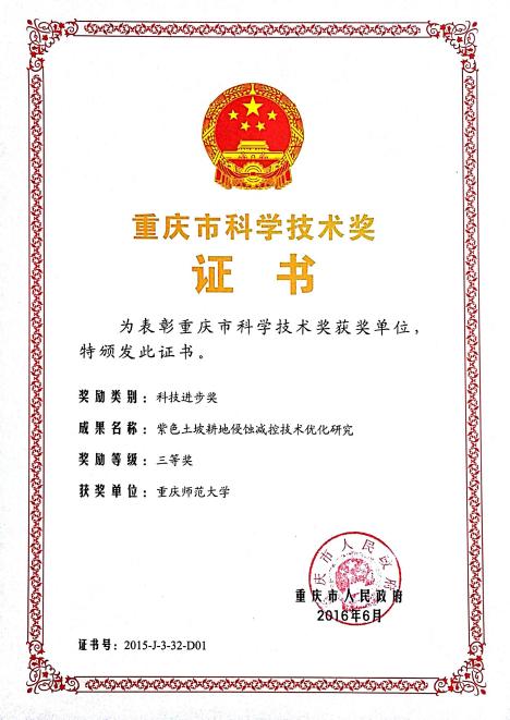 基于“两山论”和“两化路”,提出了水土保持效益评价的DPSIR框架;采用退耦思想和差分方法推导出流域侵蚀产沙人类活动影响指数的估算方法。在此基础上,研发形成了适宜于三峡库区环境条件的“大横坡+小顺坡”的侵蚀阻控技术。成果申报发明专利3项,在《Catena》、《Environmental Earth Sciences》等杂志发表论文5篇。成果得到了学界的认可,被国际大陆侵蚀委员会副主席张信宝研究员写入《环境地学科研故事》。并被写入《重庆市坡耕地水土流失综合治理试点工程项目实施方案编制大纲》,研发技术被武隆坡改梯综合治理工程所采纳。